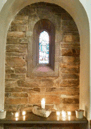 Bak i kyrkja er det ei nisje i veggen med eit lite vindu i den massive veggen. Vinduet er eit glasmåleri som syner St. Olav, tenk det! Norges vernehelgen og viktigste «pilegrimshelgen» med øks i høgre handa og ein kalk i den andre. Øksa er våpenet som felte han. Sverdmisjon seier folk, eg veit ikkje. Det hende noko med han i tida frå han rømde Norge og kom tilbake for oppgjeret med bondehæren. I nisja var det finaste av alt at det sto tende levande lys framfor helgenen. Eg takka for denne «apparisjonen». Eg har tidlegare hatt «problemer» med denne «Noregs evige konge», men har etter kvart fått ein annan oppleving av livsløpet hans som så tydeleg endra seg i tida før Stiklestad.