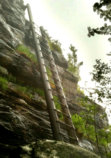 i vår tid har ungdommar gått over fjellet for å kunne bade i Strandebarm. Kan hende er det lettare når ein kjenner vegen og det ikkje striregnar, men likevel hugsa eg at eg vart imponert når eg tenkte på det oppover stien – eg var ikkje halvvegs. SAM hadde førebudd litt på vegen. Om ein har høgdeskrekk eller er ein hest!, kan ein ta ein omveg som startar lengre nede i dalen. Men eg har vel ikkje mykje høgdeskrekk etter kva eg kan erindra, så eg vert ikkje uroa ved synet av den første stigen…Den andre stigen derimot – gjer meg meir betenkt. Eg har 14 kg på ryggen og her er det 15 våte trinn. Stigen står på kanten av eit stup og det er 80 meter ned, om ikkje 80 i fritt fall, men meir en nok til å knuse ein kropp. Kva valg har eg eigentleg? Det er det berre å ta det rolig – eitt og eitt – behalde roa; eg bestemmer meg for å ikkje sjå ned, kan ikkje risikera skjelving i føtene – panikk …