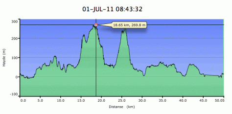 NB: Forholdet mellom etappens lengde og høyde kan gi en temmelig misvisende elevasjonsprofil. Ved lange avstander (km) virker selv stigninger til må høyder (m) adskillig brattere enn de i virkeligheten er: