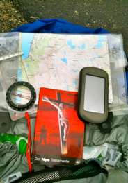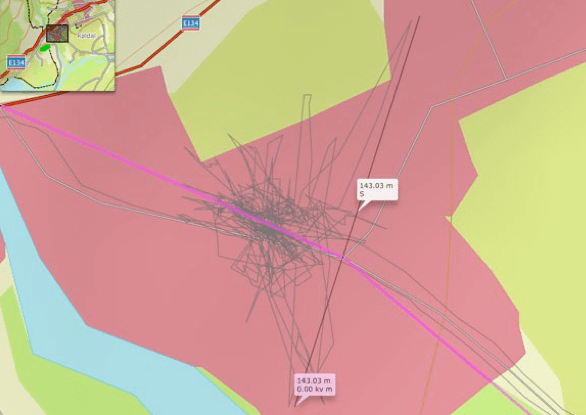 Ok, eg innrømmer at eg hadde englevakt ein gong til denne kvelden: Klokka var blitt 21 og ei elv måtte passerast. (Sjå biletet til venstre. Kart og spor er på maks storleik og er ikkje heilt rett, men sirkelen viser der overfarta var.