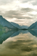 Etter denne spektakulære vegtraseen kjem ein inn i lettare terreng og inn mot Stigatjørna som for meg låg innhylla i trolsk skodde. Røydalsvatnet ligg vakker til, og i sol og varme hadde dette vore ein klar (fot)badeplass. No var den vonde foten ikkje vond lengre, så det var berre å fortsette over lyngheiene; eg misste stien eit par gonger, men då eg fann skiltet mot Strandebarm vart stien tydeleg, om enn som ein liten bekk… Nede i lia hadde regnet stoppa og eg tok av fjellstøvlane. Føtene hadde vore lenge våte, «oppvask-bleike» og det har nok vore så som så med stell av fjellstøvlane gjennom høst, vinter og vår etter at dei tok meg til Santiago i september i fjor. Ustelt goretex duger ikkje noko særleg i seriøst vått ver. Då eg kom til første huset mana eg meg opp og banka på; om dei kunne avsjå nokre gamle aviser? Snart kom mannen tilbake med gårsdagens Bergens Tidende. «Det er heilt greitt» sa han då eg protesterte.