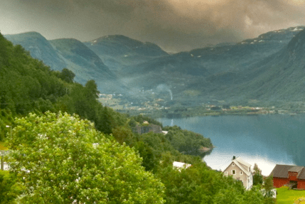 Eg kan sjå inn til Eikelandsosen der eg skal forlate sjøen og ta innover landet mot Hålandsdalen.