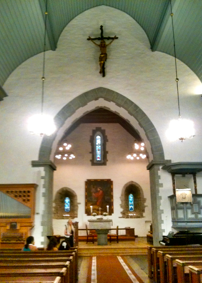 Bak i kyrkja er det ei nisje i veggen med eit lite vindu i den massive veggen. Vinduet er eit glasmåleri som syner St. Olav, tenk det! Norges vernehelgen og viktigste «pilegrimshelgen» med øks i høgre handa og ein kalk i den andre. Øksa er våpenet som felte han. Sverdmisjon seier folk, eg veit ikkje. Det hende noko med han i tida frå han rømde Norge og kom tilbake for oppgjeret med bondehæren. I nisja var det finaste av alt at det sto tende levande lys framfor helgenen. Eg takka for denne «apparisjonen». Eg har tidlegare hatt «problemer» med denne «Noregs evige konge», men har etter kvart fått ein annan oppleving av livsløpet hans som så tydeleg endra seg i tida før Stiklestad.