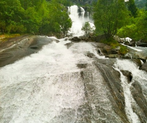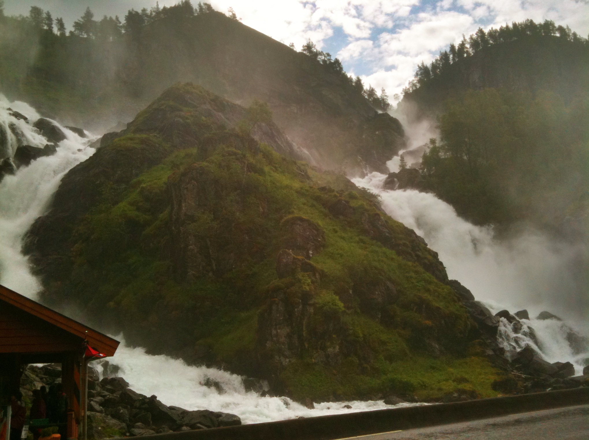 Det sto både bilar og bussar parkert ved fossen som evig driv over vegen. Her var det på med ponchoen. Asfalten var våt, svart av skam; føtene kunne trenge ein god kvil. Fire og ein halv time, berre med eit stopp like etter Hildal.