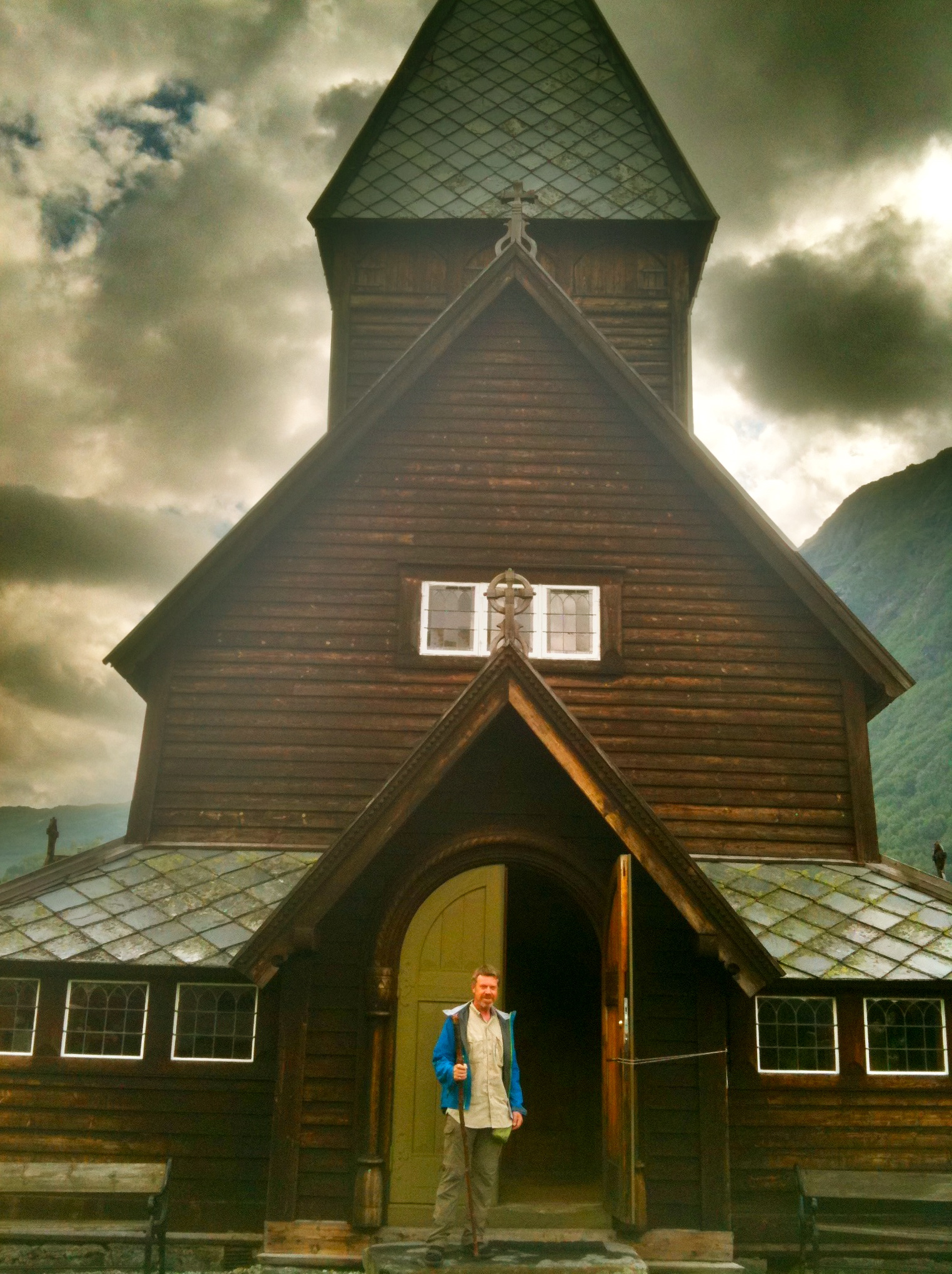 Ikkje for det, ho er blid og hyggjeleg og blir med inn for å gje litt valuta for blodprisen; det er mykje interessant å høyre om kyrkja. Dette er ei tidlegare stavkyrkje, og eldste kjende kjelde seier ho i alle fall stod her i 1309. Seinare vart ho bygd om. Reformasjonen satte sitt preg på kyrkja; ein staseleg preikestol er frå den tida. Det oser av gammalt kyrkjeliv.