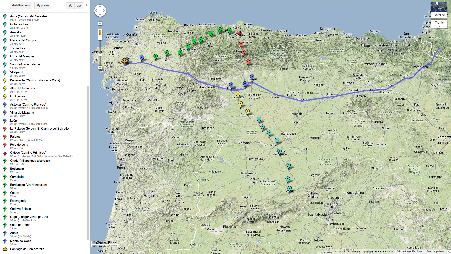 Den blå linjen er Camino Francés. Den andre ruta gikk jeg i 2010 (Camino Carmel)